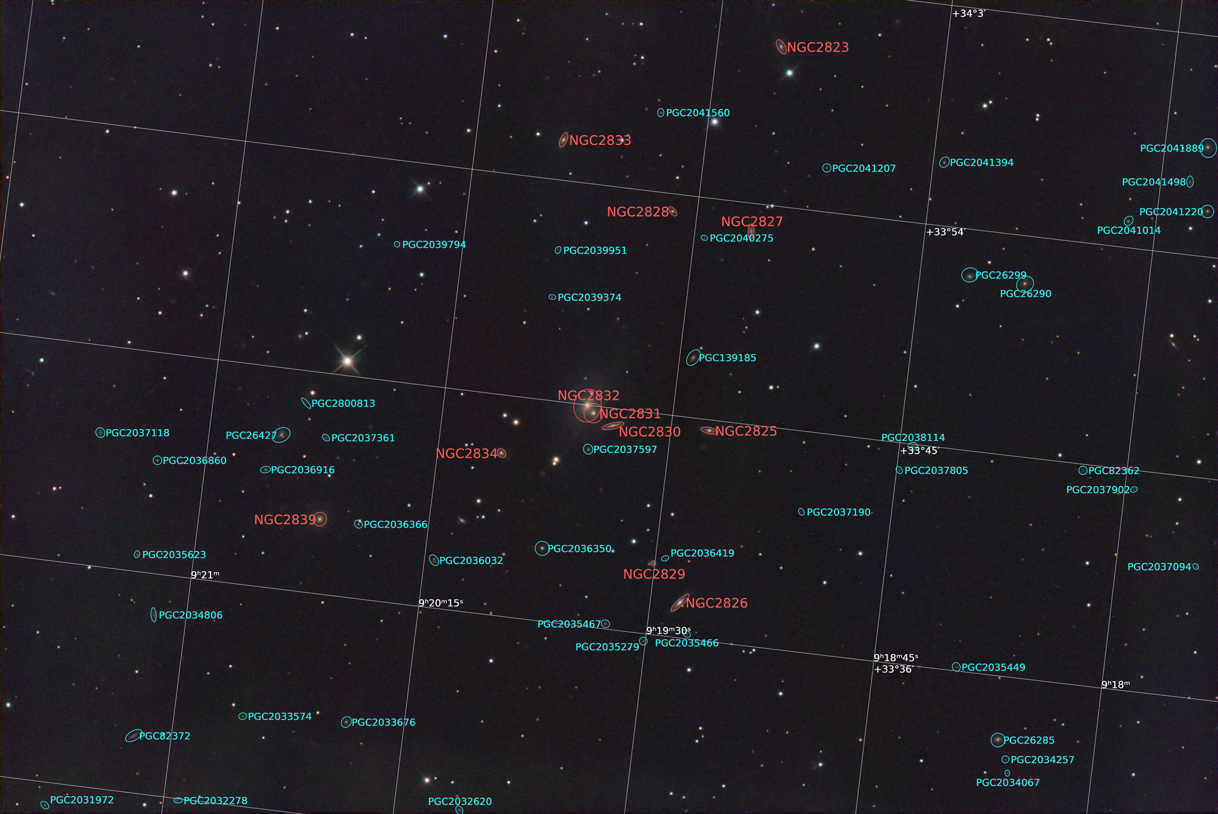 NGC 2832 is a type-cD galaxy and is the brightest member of Abell 779 galaxy cluster. NGC 2832 appears to interact tidally with NGC 2831, which lies about 25 arcseconds away and shares the same halo with NGC 2832. The edge-on spiral galaxy NGC 2830 lies 80 arcseconds southwest of NGC 2832. The galaxy has a strong central X-ray emission and diffuse emission around it. The galaxy hosts a supermassive black hole whose mass is estimated to be 3.6×109 M☉.