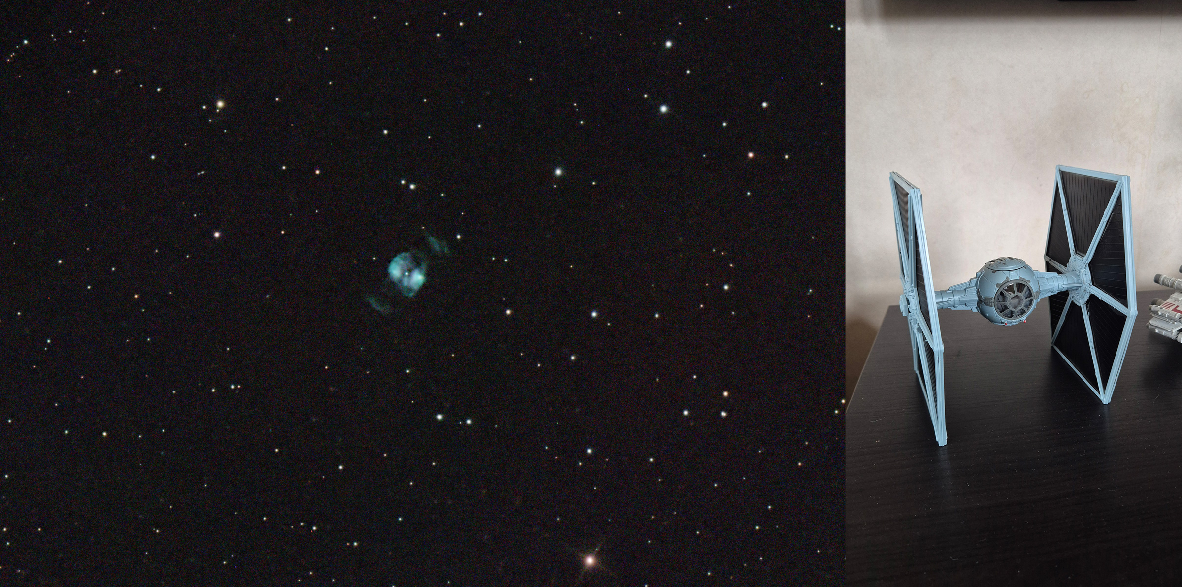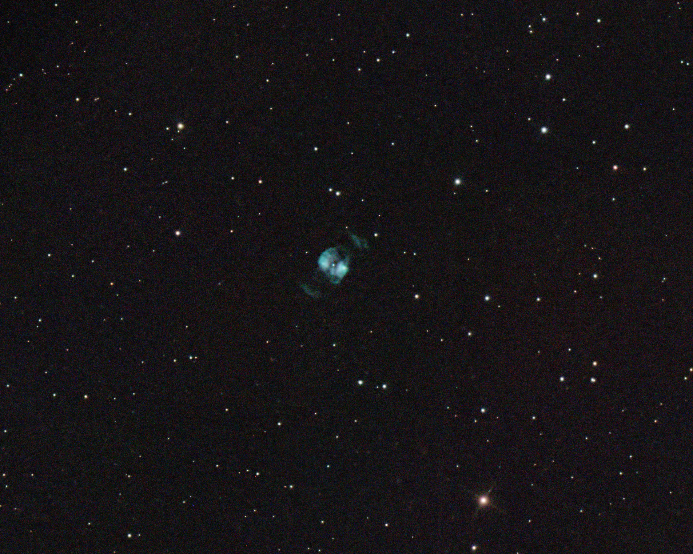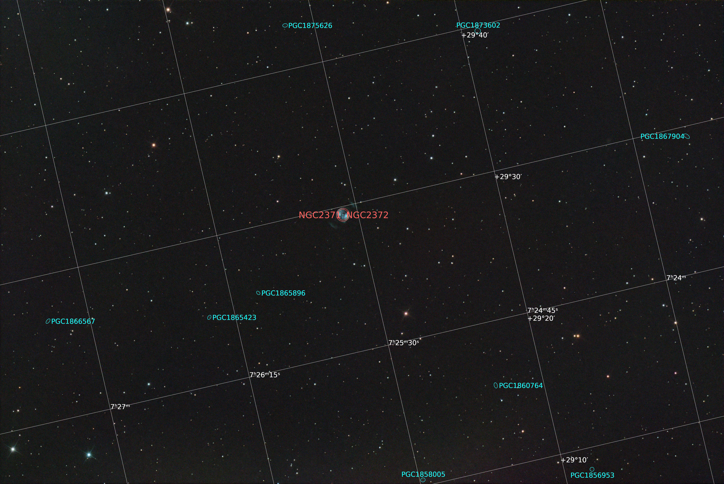 NGC 2371-2 is a dual lobed planetary nebula located at a distance of 4400 light years in the constellation Gemini. Visually, it appears like it could be two separate objects; therefore, two entries were given to the planetary nebula in the New General Catalogue, so it may be referred to as NGC 2371, NGC 2372, or variations on this name. It has also been called the double bubble nebula.